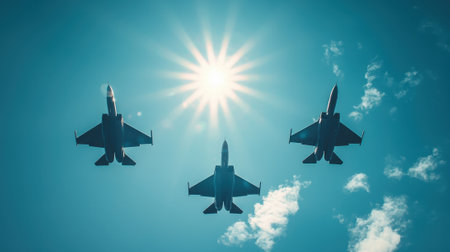 Three jets fly in formation against a vibrant blue sky, with the sun shining brightly above. The aircraft showcases their agility and speed, performing at an air show.