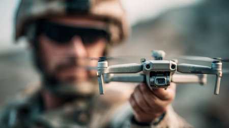A soldier dressed in tactical gear and a mask controls a small drone in a desert setting. The clear blue sky contrasts with the sand, highlighting the modern military technology in use.