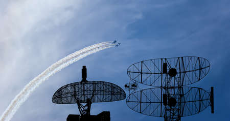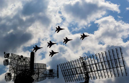 Air defense raiders of military mobile anti-aircraft complexes (radar is designed and automatic tracking of targets and missiles) against the background of the flight of modern combat fighters,Russia