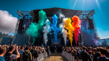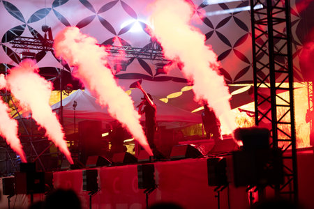 Vibrant concert stage with dramatic smoke and dynamic lighting effects