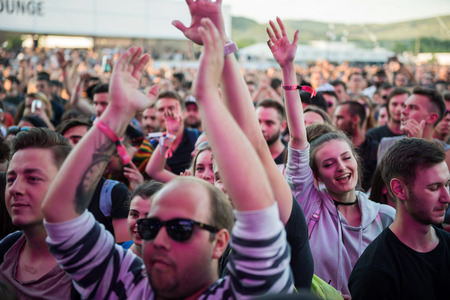 BONTIDA, ROMANIA - JULY 16, 2017: Crowd of cheering people partying during a concert performed by Suie Paparude at Electric Castle festival
