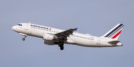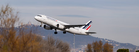 Air France Airbus A320-200 airplane takes off from Barcelona Airport