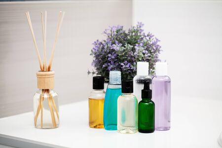 luxury design aroma reed diffuser glass bottle display on the grey table in the bedroom near the window during sunlight afternoon