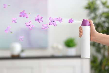 Woman spraying floral air freshener at home