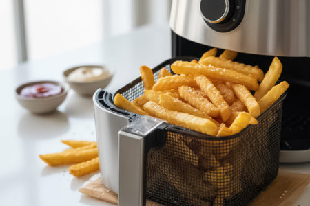 Modern air fryer with crispy golden fries in basket, stylish kitchen appliance for home cooking and healthy meal preparation, sleek design and user-friendly interface