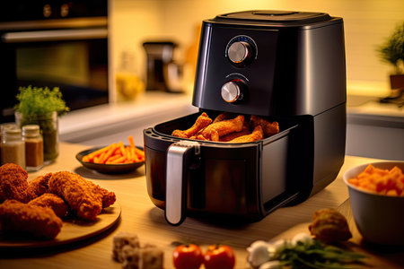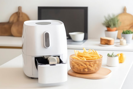 Modern kitchen with electric french fries machine - air fryer with french fries on table, closeup. Generative AI