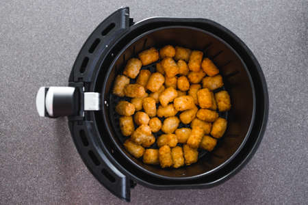Close up flat lay image of an air fryer oven on kitchen countertop. This offers fast and easy crispy food with little or no fat by circulating hot air inside the basket. A healthy snack alternative.