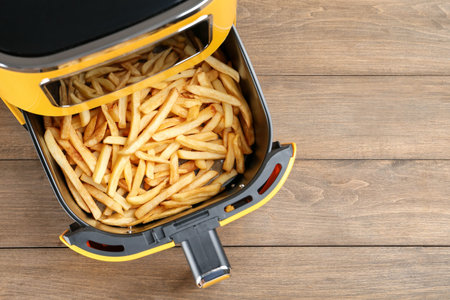 Air fryer with cooked fries on wooden table, top view. Space for text