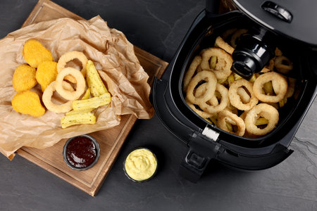 still life of different delicious dishes made with the airfryer, healthy food concept