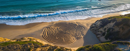 A mesmerizing sand labyrinth, created on a beach, with intricate patterns resembling a work of art. The aerial view captures the harmonious blend of natural materials and landscape AIG50