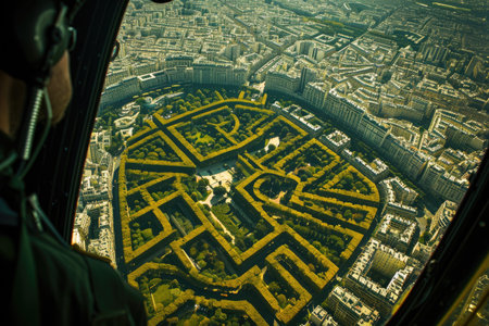 aerial view of a hedge maze at sunset, intricate garden paths. nature and exploration concept