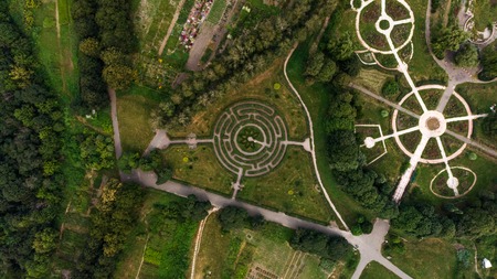 Green labyrinth in garden geometrical symmetry maze Aerial drone view