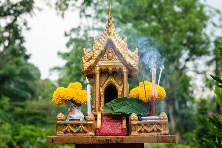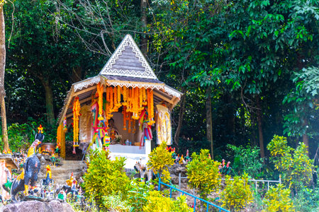 Small Buddhist religious shrine shrines in tropical nature in Phang Nga Province Siam Southern Thailand in Southeast Asia.