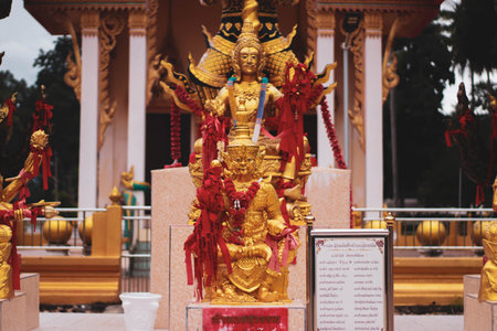Golden Four-Faced Brahma Statue Adorned with Orange Marigold Flower Garlands at Hindu Buddhist Shrine