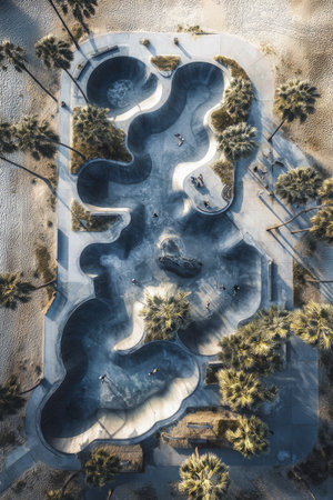An overhead shot presents a skatepark with curved concrete features. The image showcases the skatepark's design and arrangement of palm trees. The style suggests a combination of aerial photography. This image can be used for commercial and editorial purposes.