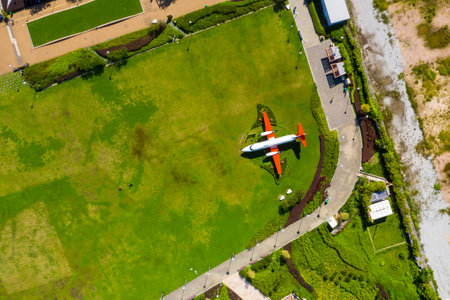 Aerial view of airplane flying over the green garden in bangkok, Thailand