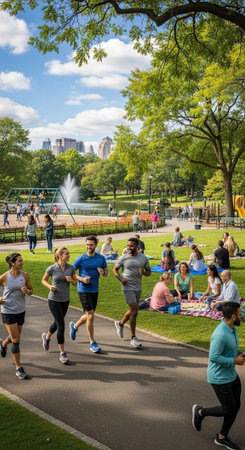 People jogging and relaxing in a vibrant urban park on a sunny day with lush greenery