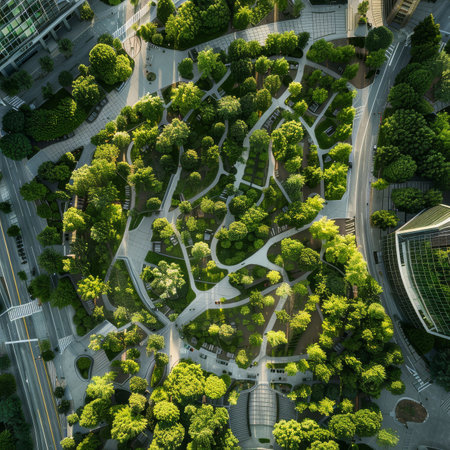 New urban park features walking paths and green spaces in a busy city area