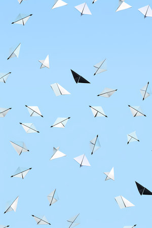 Paper planes flying in the blue sky. Abstract background. 3d rendering