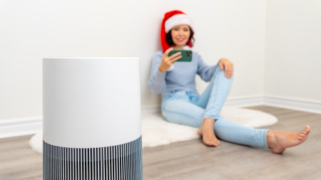 Air filter device prominently displayed in a stylish home, while a woman in a Santa hat relaxes on the floor, enjoying her smartphone in comfort
