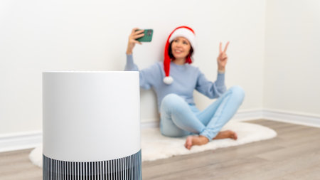 Air purifier prominently displayed while a woman in a Christmas hat takes a selfie, enjoying fresh air and a cozy atmosphere during the holiday season