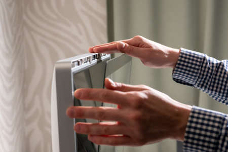 Technology and Lifestyle. Young man using air purifier for healthy living at home.