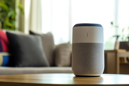 A sleek smart speaker is set on a wooden table, surrounded by bright natural light and a comfortable living area.