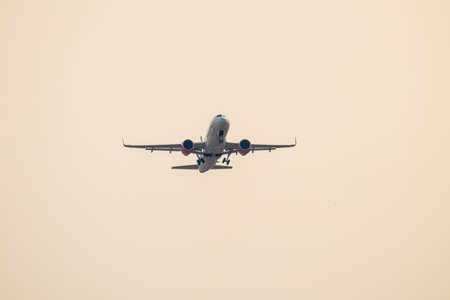 Nonthaburi, Thailand - August 18, 2019 : Closeup passenger airplane is rising into the blue sky.