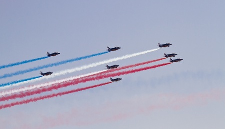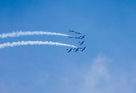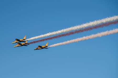 Airshow of military jet fighters. Group of military airplanes performs maneuvers with a smoke trace. Aviation background