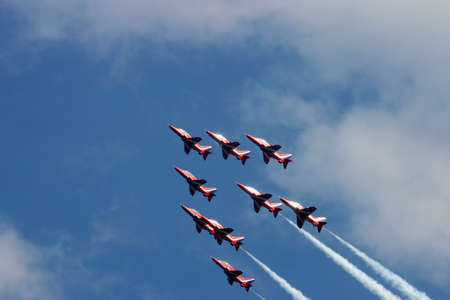 RAF Fairford, Gloucestershire, UK - July 13, 2014: Royal Air Force (RAF) Red Arrows formation aerobatic display team flying British Aerospace Hawk T.1 Jet trainer aircraft.
