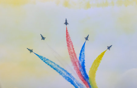 J-10 of China Air Force Aerobatics team on formations with colorful smokes venting from the plane.