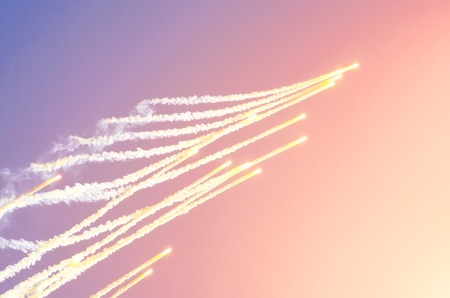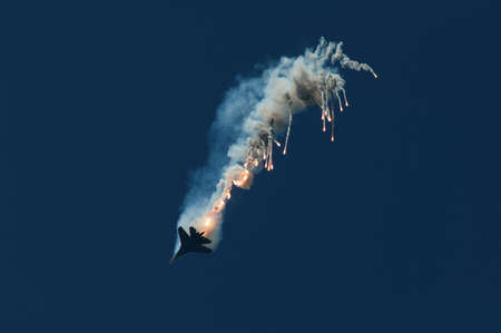 Aircraft fighter flies and shoots heat guns in the blue sky...