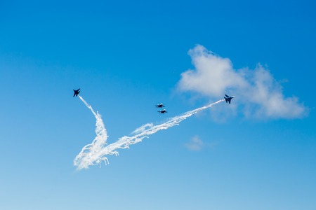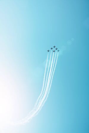 Airshow of military jet fighters. Group of military airplanes performs maneuvers with a smoke trace. Aviation background