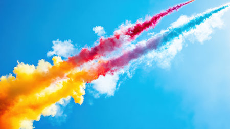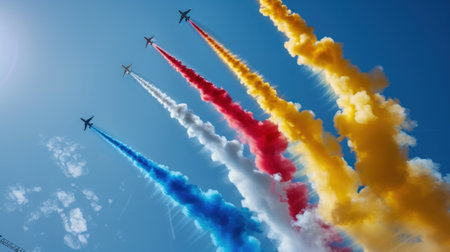 Vibrant smoke trails from airplanes create a stunning aerial display against a clear blue sky. This captivating scene showcases the artistry of flight.