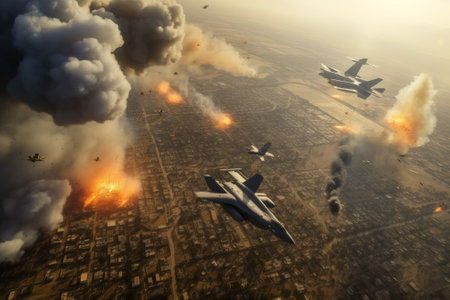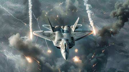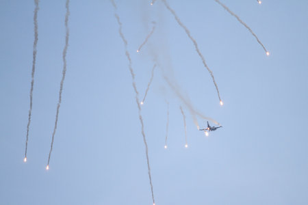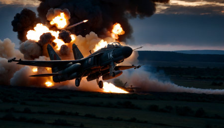 A dramatic scene captures a military jet ejecting flares above a fiery explosion on the battlefield at dusk, a dynamic illustration of air defense tactics.. AI Generation