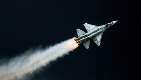 Air to air missile soars through the sky with a powerful jet propulsion, leaving a trail of smoke against a dark background showing its design and maneuverability.
