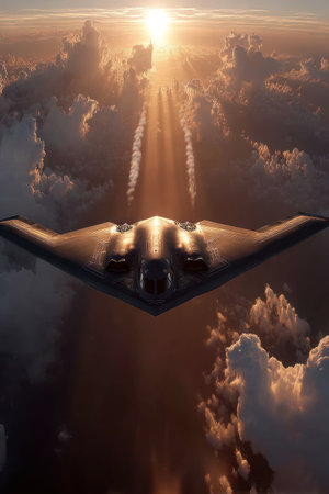 An aircraft is depicted soaring amidst a celestial scene. The sleek, dark aircraft, likely a bomber, is seen from below, bathed in sunlight breaking through the clouds. The image employs strong lighting and shadows. Suitable for use in editorial content or commercial applications.