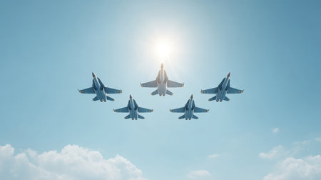 A striking display of military aircraft flying in a precise formation against a bright sky, showcasing the power and agility of modern aviation in an aerial performance.