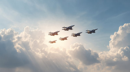 A dynamic portrayal of military jets flying in a tight formation through the blue sky, with dramatic clouds and sunlight creating an inspiring aerial scene.