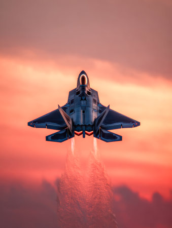 A sleek fighter aircraft accelerates skyward against a fiery sunset glow, its blazing afterburners illuminating the colorful horizon in a dynamic display of power and agi
