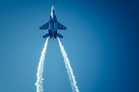 bright blue sky with jet fighter formation flying