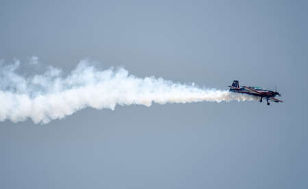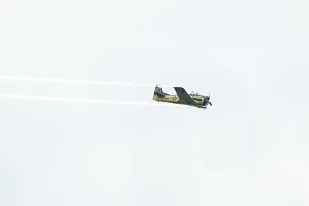Leszno, Poland - June 16 2023: Antidotum Airshow Leszno 2023 and acrobatic shows full of smoke of The Fyling Bulls Acrobatic Team on a cloudy sky