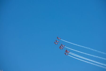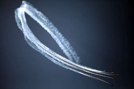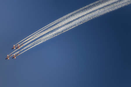 Aerobatics, air show. Aircraft team performing in the sky with white lines and blue sky