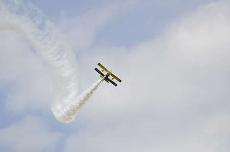 BUCHAREST, ROMANIA - OCTOBER 4, 2014: Aerobatic airplane pilots training in the sky of the city. Colored airplane with trace smoke.