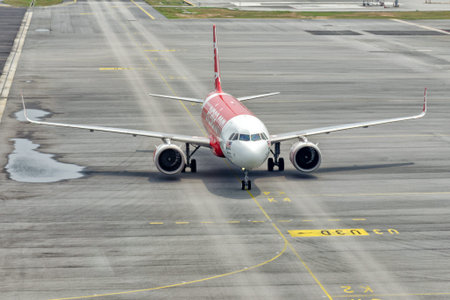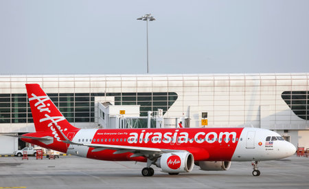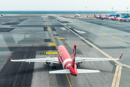 Kuala Lumpur, Malaysia - Oct 17, 2017. An Airbus A320 aircraft of AirAsia on runway at Kuala Lumpur International Airport (KLIA2).