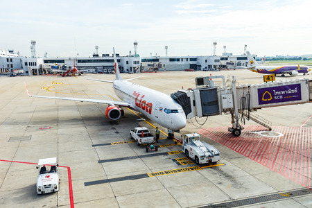 BANGKOK, THAILAND - 12 SEPTEMBER 2015 - Jet way from terminal to Boeing 737 aircraft at Don Mueang International Airport.
