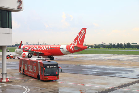 KUALA-LUMPUR - MAY 06: docked Airasia jet airline on May 06, 2014 in Kuala-Lumpur, Malaysia. AirAsia Berhad is a Malaysian low-cost airline headquartered in Kuala Lumpur, Malaysia