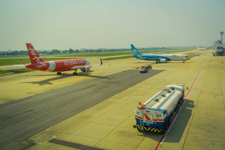 BANGKOK, THAILAND - FEBRUARY 01, 2018: Beautiful outdoor view of commercial aircraft, airasia and nokair ans truck at one side in Bangkok international airport in Thailand