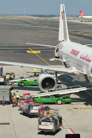 Istanbul / Turkey - September 14, 2019: Airport workers loading the luggage bags into a Tunisair Airbus A320 at the new Istanbul Airport, Istanbul Havalimani in Turkey
