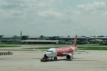 Don muang, Bangkok, Thailand, June 6, 2018 : Airbus A320 neo of of Thai Airasia parking on the runway to prepare for flight.
